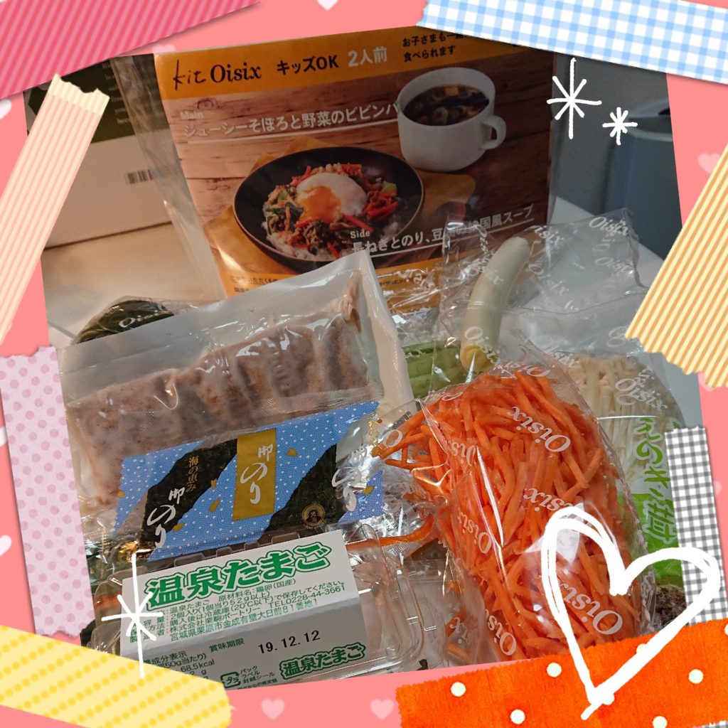 oisix のキットの袋の中身も、すぐに作れるたくさんのお野菜が入っています。素材も新鮮です。なんだかお料理を作るのがとても楽しくなりそうです。にんじんは細切になっていたので、手間が省けましたよ。調理法や温泉卵の作り方もきちんと記載があって、お料理初心者さんも簡単です。感動!