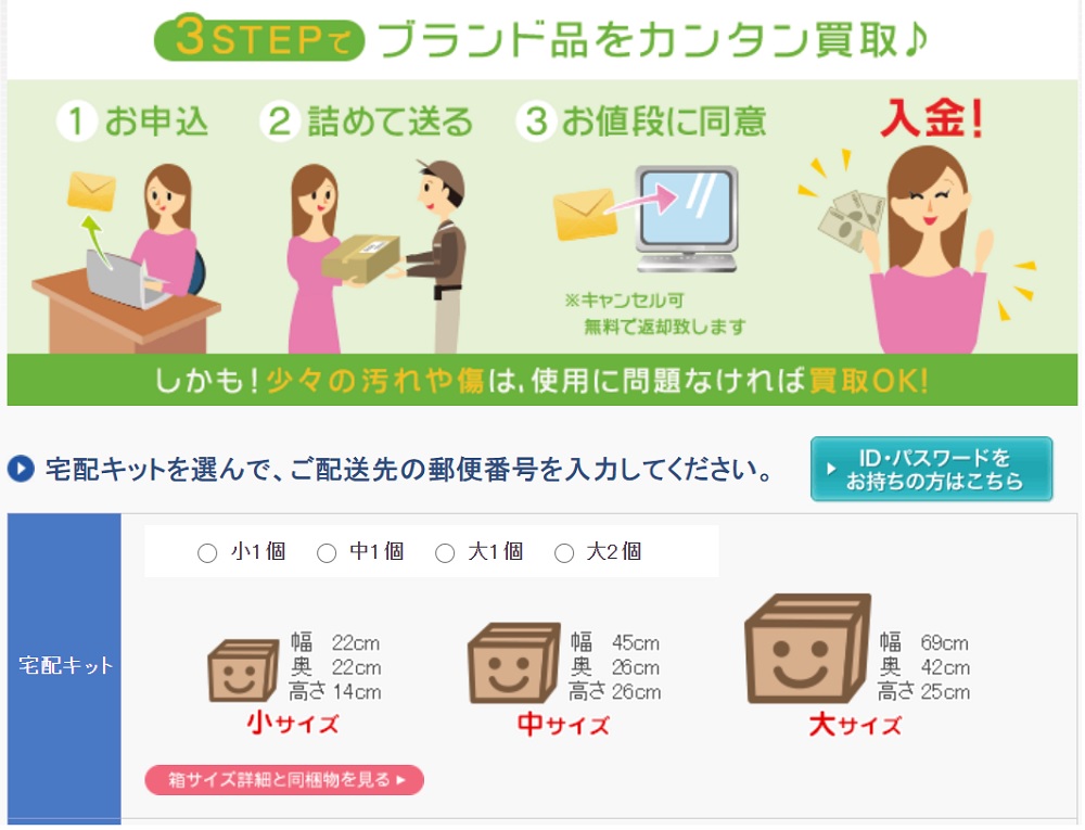 ネット上から宅配キットの送付を申し込みし、箱が届いたら、不要な品物を詰めて返送します。